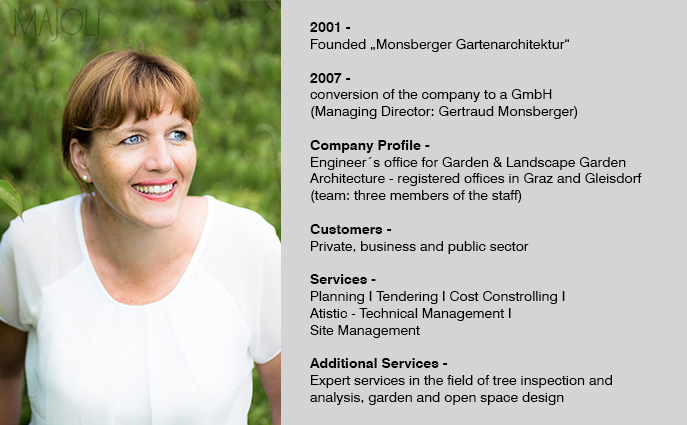 ING. GERTRAUD MONSBERGER > Graduate of the HBVLA Horticultural College in the Schönbrunn district of Vienna; studied at the University of Natural Resources and Life Sciences Vienna – main field of study garden and landscape planning. Extensive professional experience working in Germany, Austria and Switzerland. Collaboration with the internationally renowned Swiss landscape architect Professor Dieter Kienast (who died in 1998).